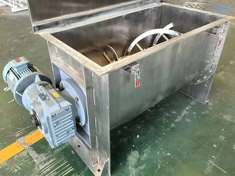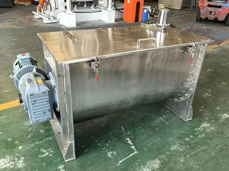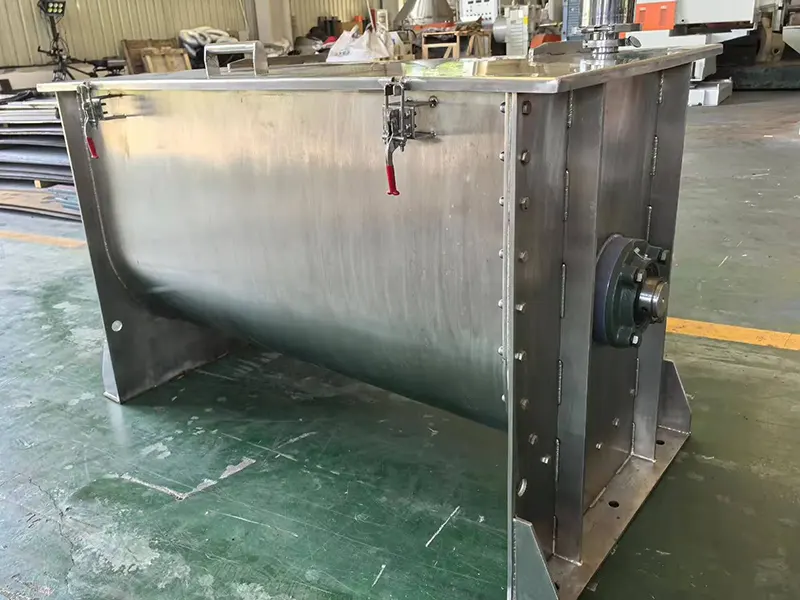 The ribbon blender consists of a U-shaped horizontal trough, a double helical ribbon agitator, and a drive system. It is designed to achieve fast and uniform mixing of powders, granules, and low-viscosity materials.
